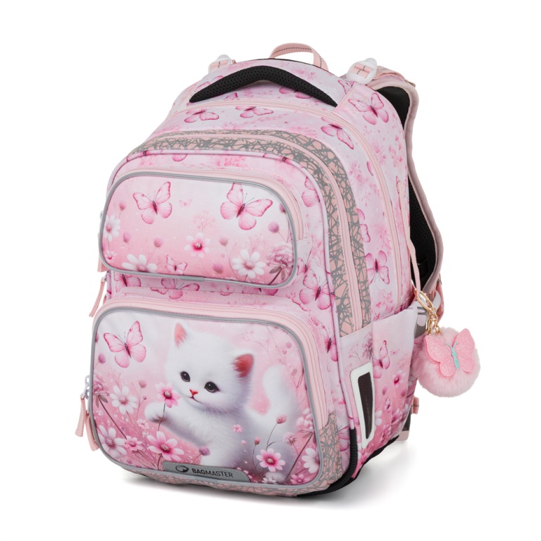 S ružovým dvojkomorovým batohom s mačičkou pôjdu všetky dievčatká do školy s úsmevom. Vďaka presnému chrbtovému systému s bedrovým pásom a hmotnosti pod kilogram je vhodný aj pre menšie deti (už od 115 cm). Batoh je ideálny pre prváčky, ale vydrží minimálne do tretej triedy. Školákov a rodičov očaria aj bezpečnostné reflexné prvky, bočné vrecká na fľašu a ďalšie vychytávky.. Ramenné popruhy a chrbtový systém sú mäkko polstrované.
