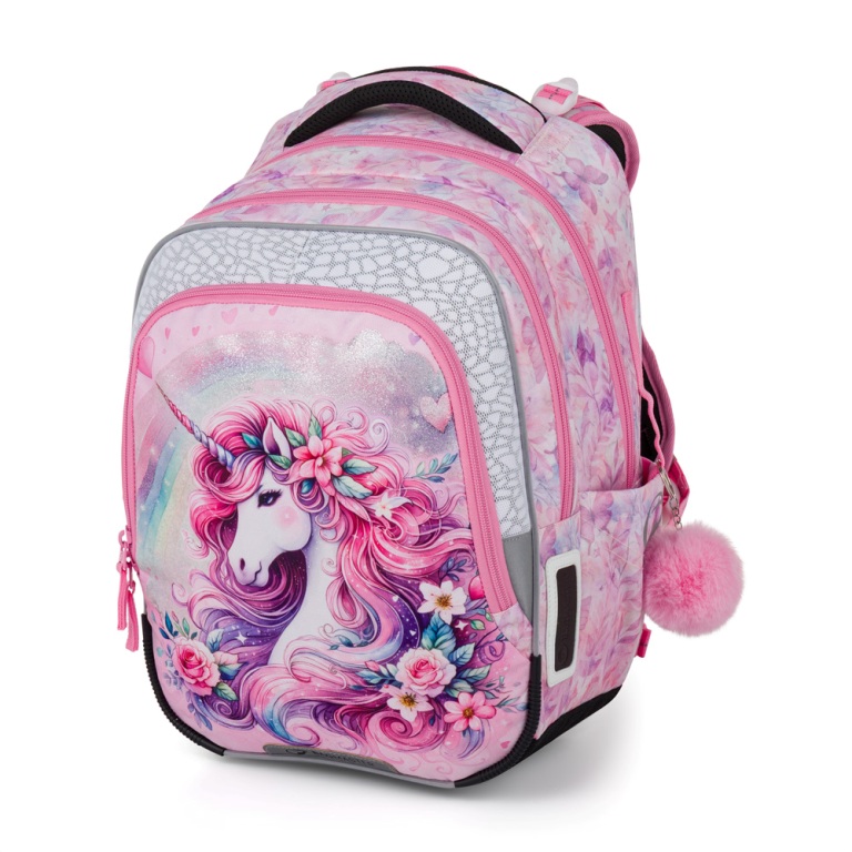 Elegantný batoh pre dievčatá s trojkomorovým usporiadaním pre učebnice a zošity, ergonomicky tvarovaným chrbtovým systémom pre pohodlné nosenie a reflexnými prvkami - ideálny parťák pre školáčky od prvej do tretej triedy. Ramenné popruhy a chrbtový systém sú mäkko polstrované. Ergonomicky tvarovaný chrbát a priedušný bedrový pás podporujú správne držanie tela. Pružný hrudný pás napomáha stabilite batohu na chrbte. Zabraňuje skĺznutiu ramenných popruhov z ramien. Dno batohu je sklopné. Po jeho preklopení do vodorovnej polohy sa učebnice a zošity dovnútra ľahšie ukladajú. Batoh stojí na štyroch plastových nožičkách, takže nespadne doma pri písacom stole ani pri lavici. Školák si ho môže zavesiť za látkové pútko.