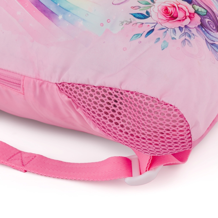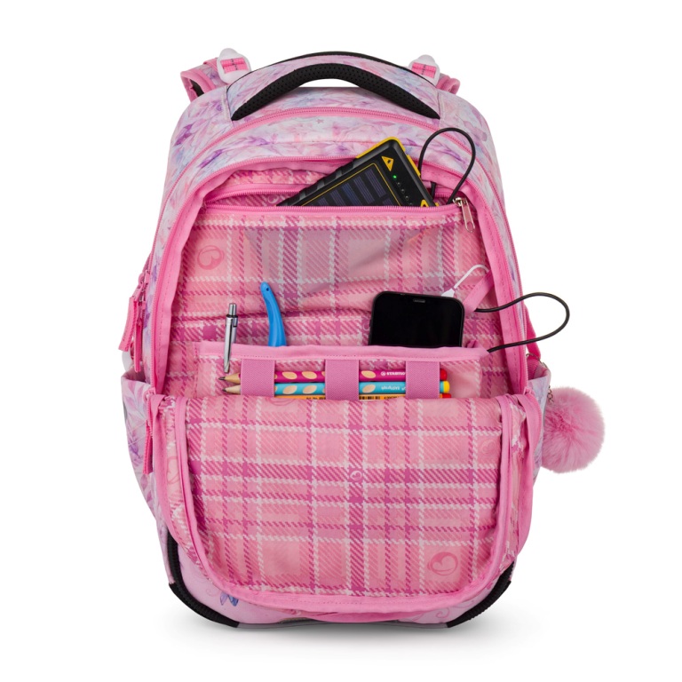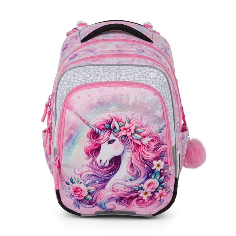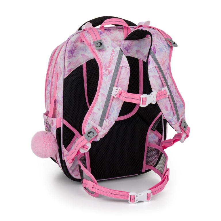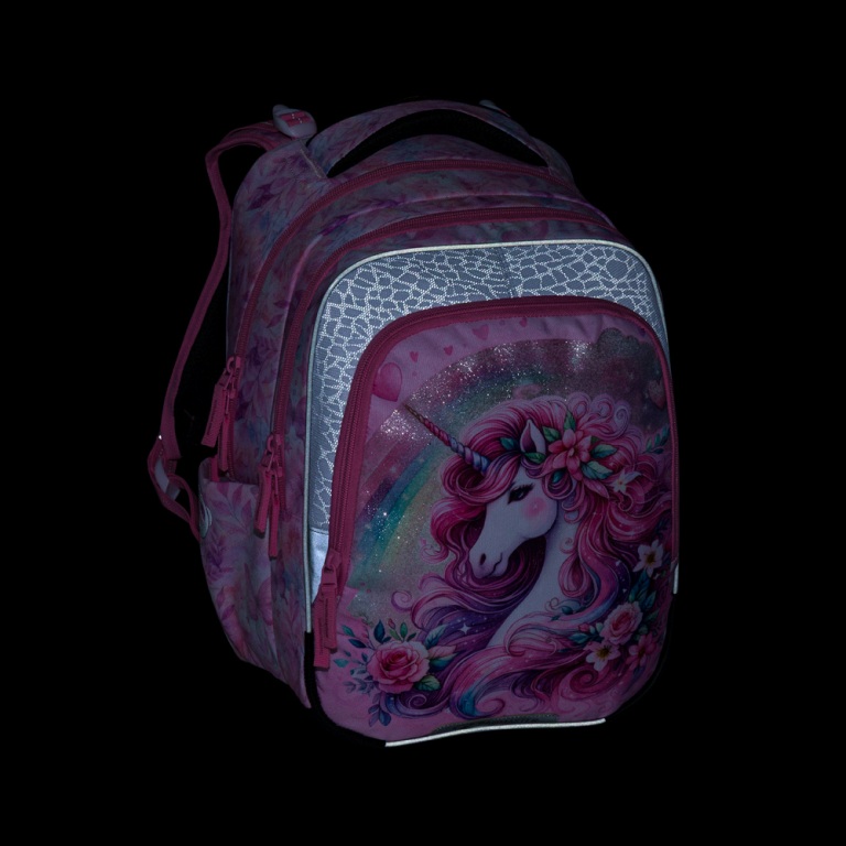 Elegantný batoh pre dievčatá s trojkomorovým usporiadaním pre učebnice a zošity, ergonomicky tvarovaným chrbtovým systémom pre pohodlné nosenie a reflexnými prvkami - ideálny parťák pre školáčky od prvej do tretej triedy. Ramenné popruhy a chrbtový systém sú mäkko polstrované. Ergonomicky tvarovaný chrbát a priedušný bedrový pás podporujú správne držanie tela. Pružný hrudný pás napomáha stabilite batohu na chrbte. Zabraňuje skĺznutiu ramenných popruhov z ramien. Dno batohu je sklopné. Po jeho preklopení do vodorovnej polohy sa učebnice a zošity dovnútra ľahšie ukladajú. Batoh stojí na štyroch plastových nožičkách, takže nespadne doma pri písacom stole ani pri lavici. Školák si ho môže zavesiť za látkové pútko.