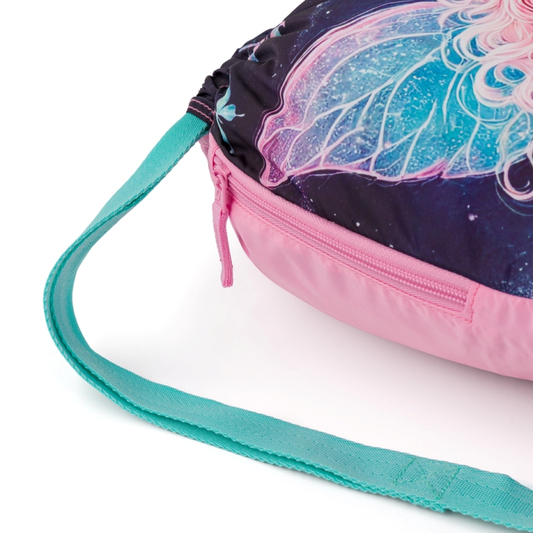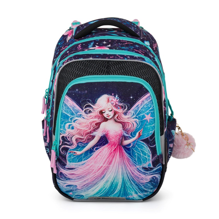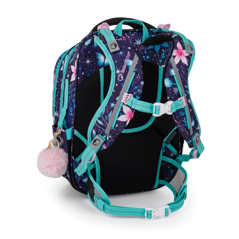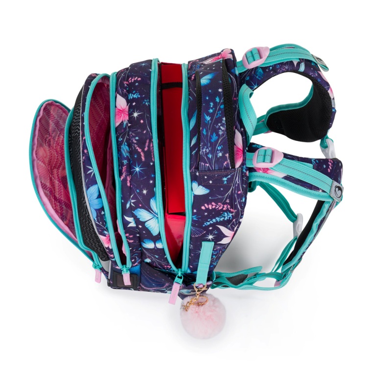 Elegantný batoh pre dievčatá s trojkomorovým usporiadaním pre učebnice a zošity, ergonomicky tvarovaným chrbtovým systémom pre pohodlné nosenie a reflexnými prvkami - ideálny parťák pre školáčky od prvej do tretej triedy. Ramenné popruhy a chrbtový systém sú mäkko polstrované. Ergonomicky tvarovaný chrbát a priedušný bedrový pás podporujú správne držanie tela. Pružný hrudný pás napomáha stabilite batohu na chrbte. Zabraňuje skĺznutiu ramenných popruhov z ramien. Dno batohu je sklopné. Po jeho preklopení do vodorovnej polohy sa učebnice a zošity dovnútra ľahšie ukladajú. Batoh stojí na štyroch plastových nožičkách, takže nespadne doma pri písacom stole ani pri lavici. Školák si ho môže zavesiť za látkové pútko.